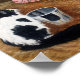 Um gato de smoking de cabelos longos, preto e branco, senta-se num celeiro olhando para uma vaca preta e branca com vitelo. Ele está esperando leite no balde brilhante de prata?
