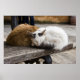 Um par de gatos dormindo em um velho banco num mosteiro Cretan.