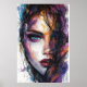 Esta surpreendente arte de parede apresenta um retrato vívido de aquarela de uma mulher cujos olhos azuis piercing exigem atenção. A peça combina pinceladas ousadas com pedaços de cores vibrantes — púrpuras profundas, laranjas ferozes, azuis legal e dourados quentes — criando um senso dinâmico de movimento e emoção. Linhas finas como tinta tecem seu cabelo, acrescentando profundidade e textura, enquanto seus lábios e seu olhar intenso evocam mistério e força. Perfeito para interiores modernos, amantes da arte, e qualquer pessoa atraída por retratos expressivos e poderosos, esta trabalho de arte faz um ponto focal dramático em qualquer espaço.
