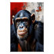 Um retrato cativante de um chimpanzé! O pelo detalhado, os olhos expressivos, e um fundo vermelho e neutro contrastante capturam a força e a emoção desse primata. Arte que celebra a beleza selvagem com um toque humano, convidando conexão com a natureza.
