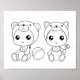 Bebês bonitos de desenho animado em rombos de animais. A da esquerda está vestida com um macacão de urso com uma bicicleta com uma pequena estrela. A da direita está vestida como um gato com uma estrela bib, e segurando um bebê chocalho em forma de sino de gato. A bola de brinquedo está descansando entre eles. Feita para uma coloração fácil.