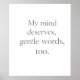 A simple, minimalist design carrying a powerful message of self-compassion. The quote, "My mind deserves, gentle words, too." is rendered in an elegant, soothing serif font and a soft, muted grey color against a light neutral background. This graphic serves as a gentle reminder to practice self-kindness, challenge negative self-talk, and prioritize mental well-being. It is perfect for those who advocate for self-care, mindfulness, positive affirmations, and emotional health. An ideal design for a calming poster, apparel, or daily motivational item.