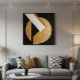 Uma composição de abstrato que mescla um círculo de ouro, triângulo escuro e faixa branca em elegante contraste. A trabalho de arte transmite equilíbrio entre força e sutileza, explorando o diálogo de formas geométricas, luz e sombra, evocando a modernidade e a sofisticação do eterno.
