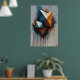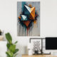 Dive into the raw energy of urban art with this striking abstract piece, 'Urban Prism: Geometric Graffiti Abstract.' This captivating artwork features a dynamic composition of bold, angular geometric forms – a large dominant prism in warm, rusted orange tones and a smaller, cool teal-blue counterpart – seemingly emerging from or breaking away from a stark, textured background.