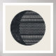 This minimalist art print features a large navy blue circle partially filled with a hand-drawn tribal pattern, creating the illusion of a lunar eclipse. The geometric, tribal pattern is made up of lines, squares, and triangles. This print comes in 3 color variations, and is bold and modern enough to be featured in a loft apartment, or in a man's living room or office.