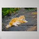 "Large Ginger and White Cat", por Catherine Sherman. Um grande gengibre e um gato branco estão se debruçando sobre um caminho escuro de pedra vulcânica cercado por seixos e um pouco de verde em uma casa em Hilo na ilha do Havaí. O olhar piercing do felino é direcionado para o espectador, dando um comportamento relaxado mas atento. Ele parece estar dizendo "Passe-me se você se atreve."