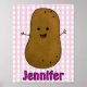 Adorável poster personalizado com uma batata marrom e giro com um sorriso grande e feliz, pontos para os olhos e braços colados. O fundo é um padrão clássico de cheque rosa e branco, gingham. Abaixo da batata, em letras roxas e cor-de-rosa, está uma modelo para adicionar seu nome ou outro texto para personalizar.