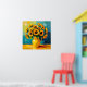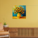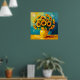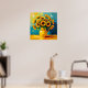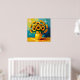 Poster com uma bela ilustração de um girassol amarelo num vaso amarelo bonito feito em estilos e fundo lacrimogêneo ou turquesa.