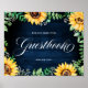 Casamento rústico country elegante e moderno, por favor, assine nosso cartaz do livro de visitas com características de flores de girassol amarelo brilhante e moldura floral de baby's breath / gipsófila com folhas em fundo de madeira de celeiro azul-marinho. Por favor, encontre mais designs e variações correspondentes na minha loja "blissweddingpaperie". E sinta-se à vontade para entrar em contato comigo para personalização adicional ou itens correspondentes.