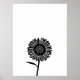 Uma ilustração negra e branca minimalista e elegante de um girassol estilizado com uma cabeça circular grande e numerosas pétalas. O girassol é representado em linhas e formas simples, criando um design limpo e moderno. A composição global é impressionante e visualmente atraente.