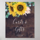 Este letreiro de madeira rústica com girassóis para cartões e presentes é perfeito para um casamento campestre ou chá de noiva. O design floral boêmio apresenta girassóis amarelos, flores rosa e folhagem verde-eucalipto em aquarela com um toque moderno e elegante. A linha de texto na parte inferior do letreiro pode ser personalizada com a data, os nomes da noiva e do noivo, ou uma mensagem curta como "Obrigado". Este letreiro pode ser usado em um casamento ou qualquer evento ou festa.