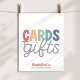 Modern rainbow “Cards & Gifts” sign, perfect for stylish parties. Featuring minimalist retro-inspired colourful lettering, it’s the perfect match for a “Two Much Fun” 2nd birthday — or any modern rainbow birthday celebration. A simple, chic addition to your gift table décor.