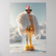 Um frango na moda vestido com um casaco branco glamouroso, calças metálicas douradas e botas peludas, acessadas com correntes de ouro e óculos escuros, posando com confiança em uma superfície de neve.