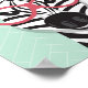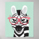 Um poster com uma zebra ilustrada, peculiar, divertida e esquisita (mostrando o rosto e o pescoço) que está vestindo um par de óculos de sol rosados flamingos e está em frente a um padrão verde de herança óssea.