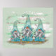 3 gnomos azuis aqua aqua na praia com estrelas-do-mar sobre fundo de madeira verde-marinho intacta.
