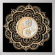 A symmetrical mandala design featuring intricate a yin yang floral pattern in gold and silver.
