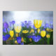 Sunny yellow and blue tulips stand out in a field on a cool, misty spring morning. In the early sunlight they stand out like golden cups of light.