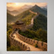 This artwork portrays the winding Great Wall of China stretching across green hills under a golden sunset. Watchtowers punctuate the stone pathway as it follows the mountain ridges, evoking centuries of history and human endeavor. It celebrates the grandeur of ancient engineering and the harmony between architecture and landscape.