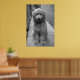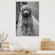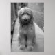Um filhote de Goldendoodle adorável e peluda sentado em um jardim de concreto caminhando ao longo de uma parede de tijolos em preto e branco.