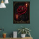 A darkly magnificent fine art poster where beauty and mortality intertwine. A single blood-crimson rose in full bloom conceals a human skull at its heart — a timeless memento mori symbol rendered in rich, candlelit oil painting style. Black thorned vines curl through the composition while two dripping candles cast a warm amber glow against the shadowy Gothic cathedral ironwork behind. Framed in an ornate gold border with blackletter typography, this piece is equal parts haunting and breathtaking. Rooted in the centuries-old Vanitas artistic tradition — the reminder that life is fleeting and beauty is temporary — this poster speaks to those who find philosophy in darkness and poetry in decay. A bold statement piece for gothic home décor, dark academia spaces, Halloween enthusiasts who decorate year-round, tattoo lovers, and collectors of dark fine art. Rich crimson, deep black, and warm candlelight gold create a palette that commands any wall it occupies.