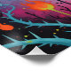 Um híbrido malicioso, corado, com marcas esqueletais e um pingente do crânio está em uma capa surreal cheia de olhos brilhantes, jack-o-lanternas, morcegos e chamas fantasmas. Árvores torcidas e uma lua crescente traem a cena, misturando horror e chorão em um mundo de sonhos vibrante. Perfeito para fãs de arte fofa e mágica. AI