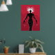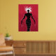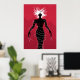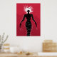 Poster demônio com uma ilustração vetorial que mostra uma personagem feminina negra estranha - fantasma assustador com cabelo branco, olhos mau ruivos e mãos deformadas com longas unhas sobre fundo vermelho. Este monstro estranho veste um vestido parecido com arame farpado com picos de vidro.