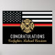 Este design apresenta uma bandeira de bombeiros com listras pretas e brancas, e uma fina faixa vermelha também. "Parabéns" e o crachá de bombeiro ficam acima do nome do bombeiro graduador. Esta design também funciona como excelente para se aposentarem bombeiros, tenentes ou chefes. Celebre em estilo!