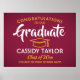 Adicione um toque personalizado a uma comemoração de faculdade ou segundo grau com um marrom elegante, ouro e poster branco de 18"x24". Todo texto é simples de personalizar. Design apresenta um fundo ombre vermelho arrojado, boné conselho amarelo de argamassa, tipografia na moda moderna e caligrafia manuscrita. Observe que o ouro é impresso a cor, não a folha metálica. Esta placa de festa de formatura é uma maneira elegante de celebrar o dia especial. Parabéns ao formando!