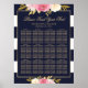 Gráfico de assentos florais com riscas brancas e azuis marinhos elegantes para 12 mesas com flores roxas cor-de-rosa pinceladas e vegetação dourada. Itens correspondentes disponíveis.