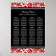 Gráfico de assentos de convidados elegante e contemporâneo, personalizável, de 12 mesas 96 para o casamento em padrão clássico de damasco floral clássico, vermelho, preto e branco moderno. Personalize com seu nome de hóspede para fazer um quadro único para seu casamento. Entre em contato conosco para obter um gráfico personalizado para um número diferente de convidados.