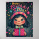 Este é um design de aniversário maravilhosamente ilustrado com uma garota bonita, de olhos grandes com cabelo escuro, bochechas rosadas e um sorriso brilhante. Ela veste um chapéu listrado colorido com pompom, combinando o fundo vivo e festivo cheio de bolhas flutuantes, estrelas e faíscas mágicas. A calorosa e desenhada tipografia de "Feliz Irmã de Aniversário" acrescenta um toque lúdico, complementando o tema da alegria e da celebração. O presente embrulhado com um arco decorativo melhora o tema do aniversário, fazer esta uma saudação ideal.