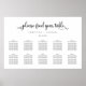 Este gráfico horizontal de assentos preto e branco é perfeito para um casamento elegante e clássico. Você pode alterar a cor de fundo. Basta clicar no link personalizar mais, mostrado na área de personalização de texto à direita, e escolher seu fundo de cor personalizado. Esta poster mostra a organização dos convidados sentados nas mesas e inclui espaço suficiente para cerca de 80 convidados. Deixe espaço para mais (ou menos) convidados clicando no botão "personalizar" e diminuindo ou aumentando o tamanho da fonte.