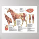 Poster de anatomia muscular dos cavalos rotulada com descrições. Vista lateral com músculos superficiais. Músculos profundos do ombro. Seção transversal das pernas.