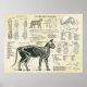 A carta anatômica de gatos mostra o sistema esquelético. Vista lateral mostrando os ossos do gato. Vista plantar e dorsal dos ossos do pé. Vista lateral do crânio. O poster é rotulado com descrições.
