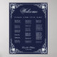 O fundo é marinho azul, todo texto é cinza claro. O gráfico alfabético de assentos é para um casamento com cores marinho e prata. Ele tem um quadro de ornamentado antigo com decorações falsas de prata nos cantos. Na parte superior, há a palavra Bem-vindo, escrita em um grande roteiro caligráfico elegante. Os nomes da noiva e do noivo são escritos na mesma caligrafia, mas menores, perto da fronteira inferior. O resto do texto está em bonés.