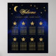 Um gráfico de assentos de casamento para 8 mesas com um tema de casamento celestial, com a lua e a estrela em um fundo azul de noite estrelada. Os números das mesas são escritos em estrelas douradas grandes. A lua, as estrelas e o texto são dourados. A palavra Bem-vindo é escrita em uma fonte caligráfica elegante.