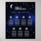 Um gráfico de assentos de casamento com 7 mesas para um tema de casamento celestial, com a lua e estrela em um fundo azul de noite estrelada. Os números das mesas são escritos em grandes estrelas cinza prateado. A lua, as estrelas e a palavra Bem-vindo (escrita em uma fonte caligráfica elegante) são cinza prateado, o restante do texto é branco.