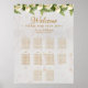 Este gráfico de assentos de casamento tem 10 mesas. O fundo é mármore branco. Na borda superior, há lírios calla brancos e feto. Os nomes dos noivos e o título Bem-vindos são escritos em uma fonte caligráfica elegante. Todo o texto tem cor dourada.