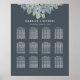 Esquema de cores bonitinho e suave em tons antigos de cinzas azuis, verde-oliva e púrpura poeirenta em fundo bonito numa matiz azul de cinza profunda. A ilustração original dos florais enfeita a parte superior deste poster de assentos de casamento a ser mostrada na sua recepção. Perfeito para qualquer casamento de primavera, verão, ao ar livre, noite ou jardim e coordena-se lindamente com as outras peças desta suíte de design.