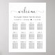 Poster de tabela de assentos de casamento baixável para 12 mesas com "boas-vindas" em um roteiro elegante com balanços, "Encontre seu assento" em tipografia serif clássica, seus nomes e data de casamento juntos por um coração e os números de mesas e nomes de convidados em uma simples tipografia moderna. Selecione a opção de download digital a ser editada com alterações de última hora e impressão localmente.