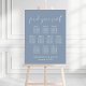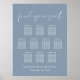 Gráfico de assentos azuis empoeirados para download de chic para até 10 mesas com "encontrar seu assento" em um roteiro branco-na moda, os números de tabela e nomes de seus convidados em simples carta branca moderna e seus nomes e data de casamento em uma tipografia elegante de serifania branca. Você pode selecionar a opção de download digital a ser editada com alterações de última hora e impressão localmente.