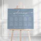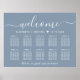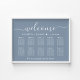 Elegante placa de poster de assentos azuis empoeirados para download para até 10 mesas com "boas-vindas" em um roteiro branco-chic, seus nomes e data de casamento juntos por um coração e "Estamos tão felizes que você está aqui" em tipografia serif branca clássica. Você pode selecionar a opção de download digital a ser editada com alterações de última hora e impressão localmente.