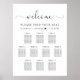 Elegante poster de assentos de casamento baixável para até 10 mesas com "boas-vindas" em um roteiro chic com balsas, "Encontre seu assento" em tipografia serif clássica, seus nomes e data de casamento juntos por um coração e os números de mesas e nomes de convidados em uma simples tipografia moderna. Selecione a opção de download digital a ser editada com alterações de última hora e impressão localmente.