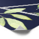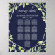 Este elegante quadro de assentos de casamento apresenta uma imagem geométrica moderna e prateada com uma coroa verde-tenda cheia de folhas num fundo azul-da-noite. Elimine facilmente as mesas que não precisar para os seus convidados de casamento.