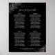 Este lindo gráfico de assentos de casamento de 4 mesas inclui atribuições de mesa para 40 convidados, com 10 pessoas em cada mesa. O design é simples, mas elegante, com texto de cinza sobre fundo preto e apresenta um filigre floral de folha fina prateada nos cantos e um título de caligrafia com script de rico que lê "por favor encontre sua mesa." Sofisticado e chique.
