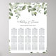 Gráfico de assentos de casamento de foliagem Eucalyptus verde com elegante caligrafia manuscrita e tipografia clássica, e na moda de folhas pintadas com aquarelas em uma paleta verde-esfarelada sobre fundo branco. Desenvolvido exclusivamente para você pelo Happy Dolphin Studio.