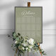 Este design apresenta um gráfico de assentos de casamento de destino tropical de praia, folhas de palmeira tropicais botânicas, uma folhagem elegante verde sage, um gráfico de assentos de boas-vindas de casamento floral, um nome de número de mesa de convidados, uma caligrafia estilosa e moderna, uma fonte tipográfica caprichosa, um quadro de pôster de recepção de casamento, uma decoração de recepção de casamento moderna e estilosa, uma decoração de recepção de casamento tropical