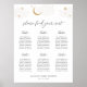 Bem-vindos aos seus convidados de chá com este gráfico de assentos com nuvens e estrelas com lua dourada. Deixe espaço para mais (ou menos) convidados clicando no botão "personalizar" e diminuindo ou aumentando o tamanho da fonte. Mesas extras também podem ser excluídas. Além da colocação de cada convidado.