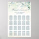Gráfico de assentos de casamento elegante com uma borda superior de cor d'água pintada de eucalipto verde. Abaixo estão seus nomes, data de casamento e uma modelo com vinte mesas de dez convidados como exemplo. O modelo pode ser personalizado para o número de mesas e convidados que você terá na sua recepção. Este gráfico de assentos simples e rústico é excelente para um casamento de temas botânicos no verão.