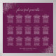 Este gráfico de assentos de casamento inclui atribuições de mesa para 150 convidados em 15 mesas. O design é simples, mas elegante, com texto de cinza em um fundo roxo ou magenta. O título está escrito em uma caligrafia de escrita falada e há decorações florais frias de folha de prata nos cantos. Na moda, chic e sofisticada maneira de ajudar seus convidados a encontrar seus assentos na sua recepção.